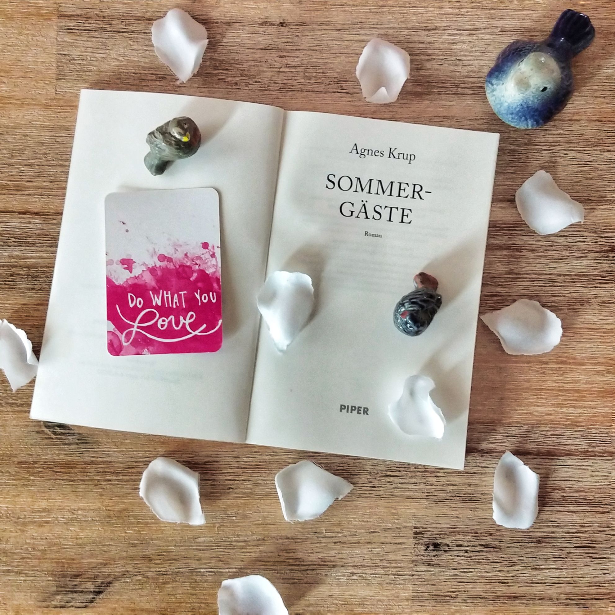 Das Buch liegt offen mit der Titelei, der Titel des Buches und die Autorin, sowie der Verlag sind zu lesen. Sommergäste von Agnes Krup, erschienen bei Piper. Darum sind weiße Blütenblätter verstreut und drei Tonvögel gesetzt. Eine Karte mit dem Spruch „Do what you love“ liegt auf dem Buch.